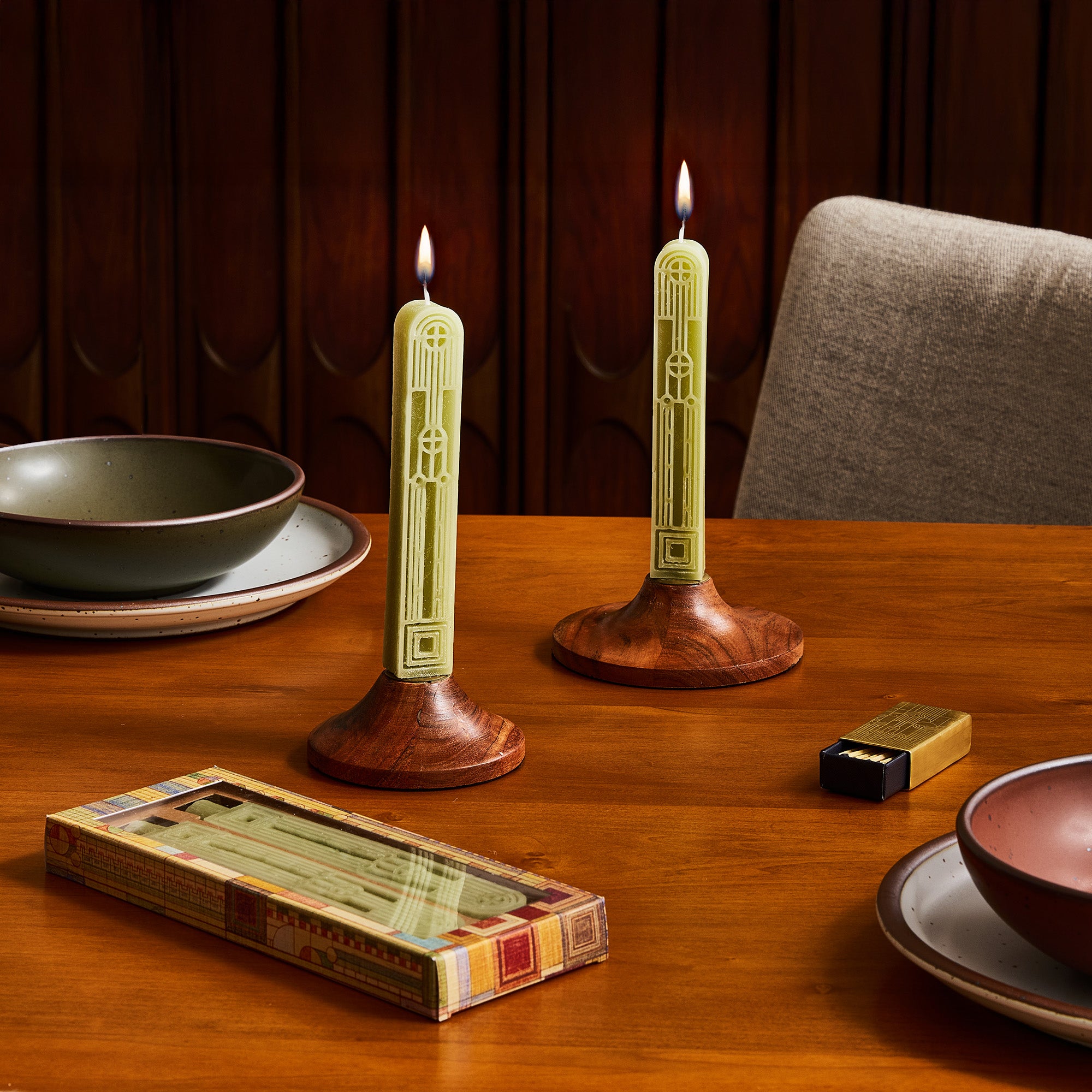 Beeswax, a naturally luxurious material known for its clean burn, makes these tapers an elevated choice for dining. Intentionally unscented, they are ideal for settings where fragrance is not desired. Presented in gift-ready packaging, they bring Wright's design language into everyday ritual with quiet sophistication.