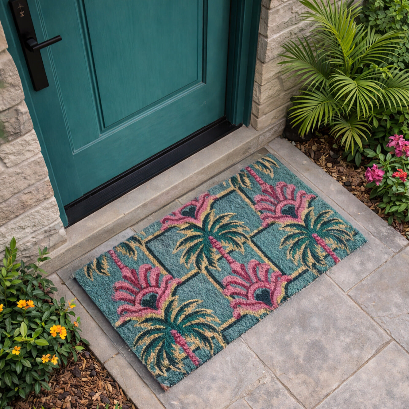 Graphic palms and geometric detailing come together in a bold design inspired by vintage Deco style. Handmade from natural coconut coir, this statement doormat brings pattern and color to the front door.