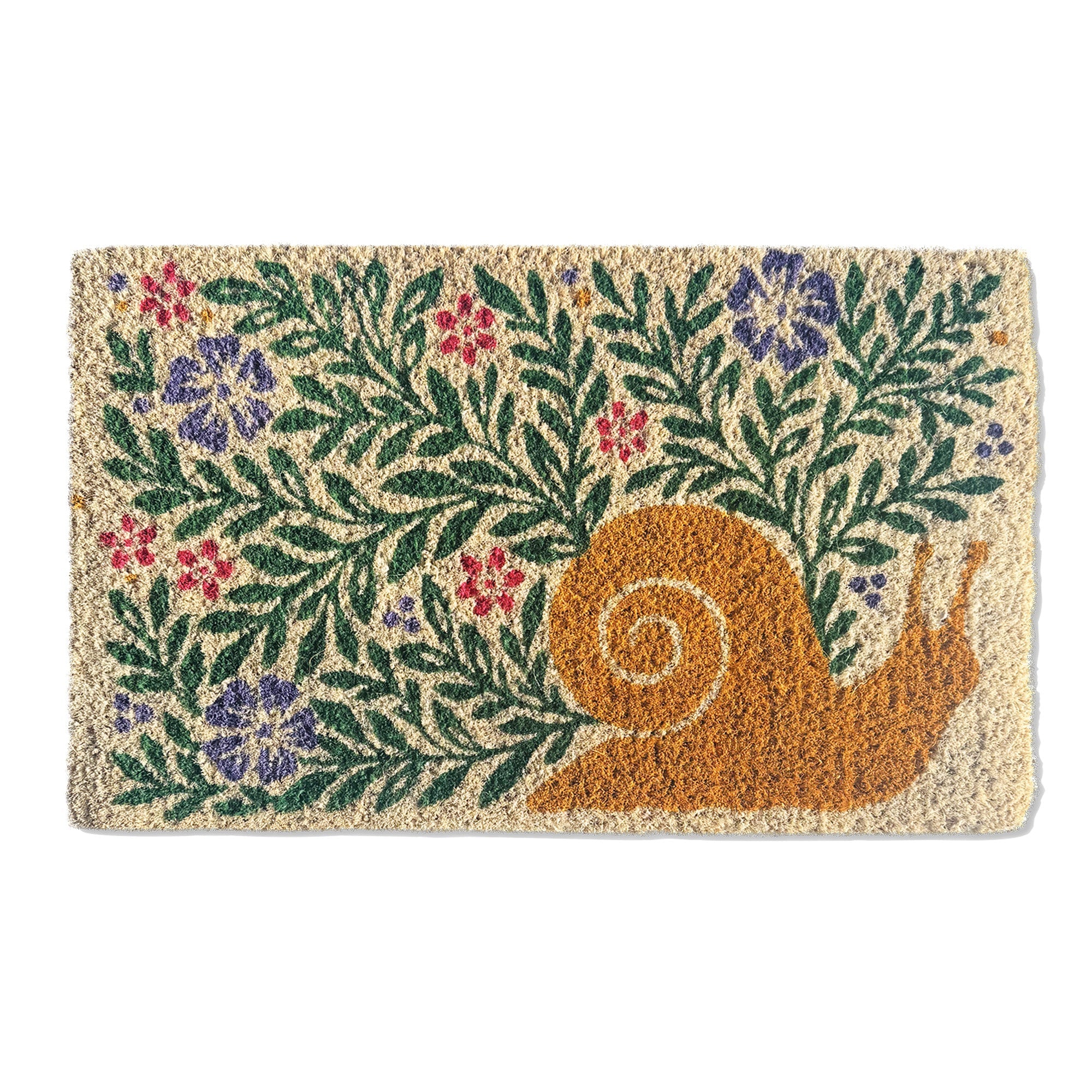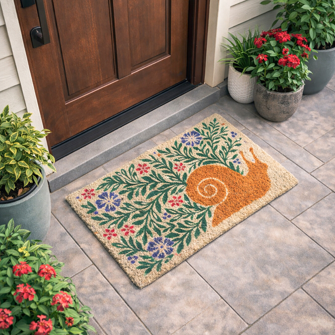 A gentle reminder to slow down, this serene garden scene features a snail nestled among winding vines and blooming florals. Handmade from natural coconut coir, this artful doormat brings a sense of ease and warmth to the entryway.