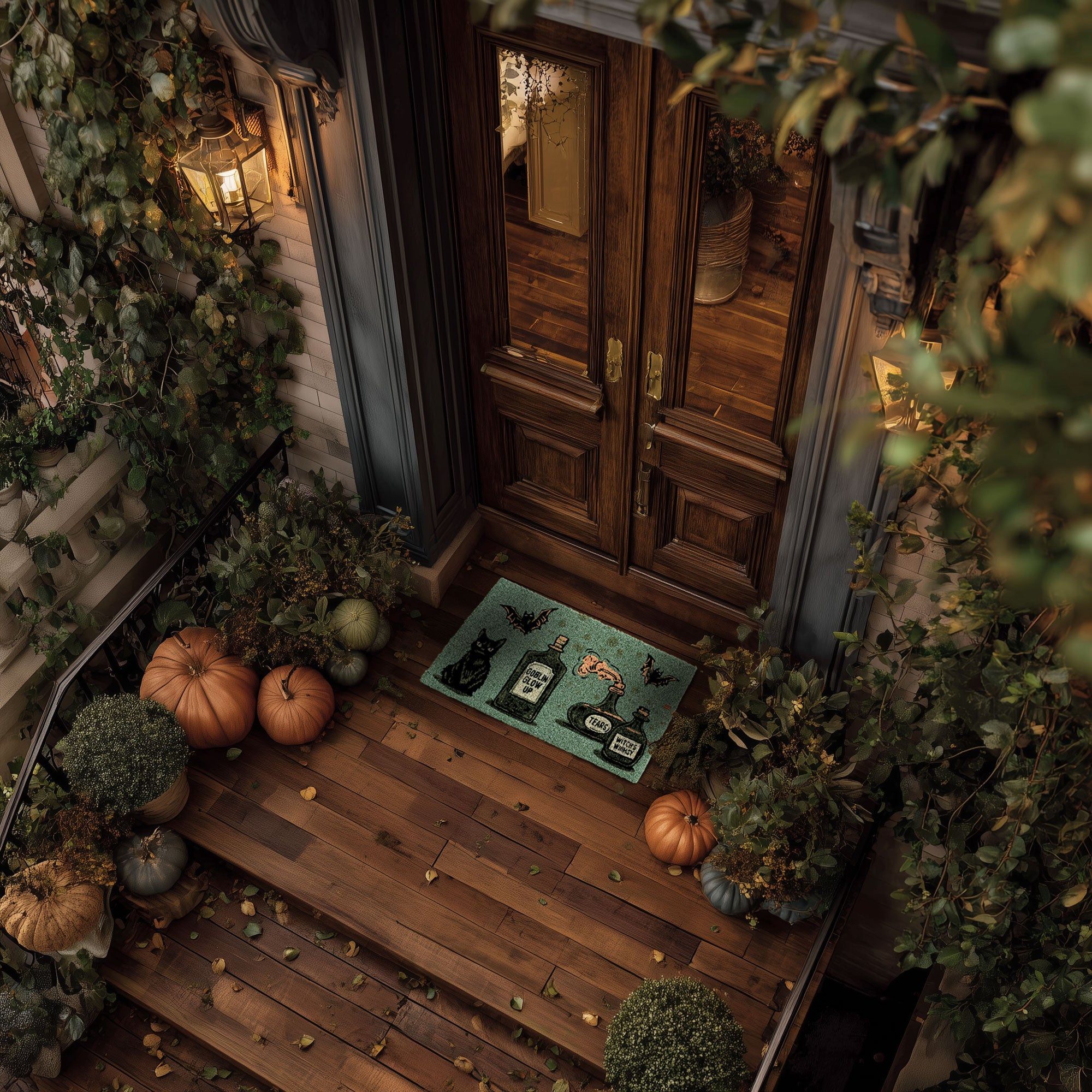 Lead the way to the witch's lair with this spell-binding scene of her poisonous apothecary! Featuring a mysterious black cat, fluttering bats, and a collection of spine-tingling potions, this ghoulish greeting is sure to bewitch trick-or-treaters on Halloween night.