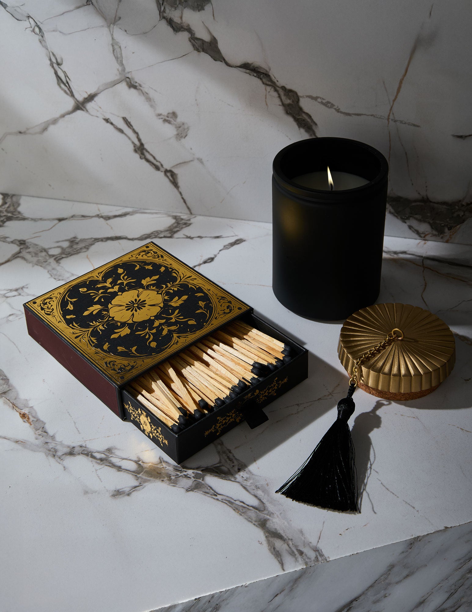 Our Match Boxes are thoughtfully designed to elevate everyday match storage. Crafted from rigid paper with a linen-like texture and finished with a grosgrain ribbon, each box is adorned with intricate gold foil detailing, reflecting our dedication to artistry and quality. Perfect for a mantel, coffee table, or bedside, these match boxes also pair seamlessly with our iconic Match Cloches—both as a refill and for elegant merchandising—bringing together form and function with effortless style.