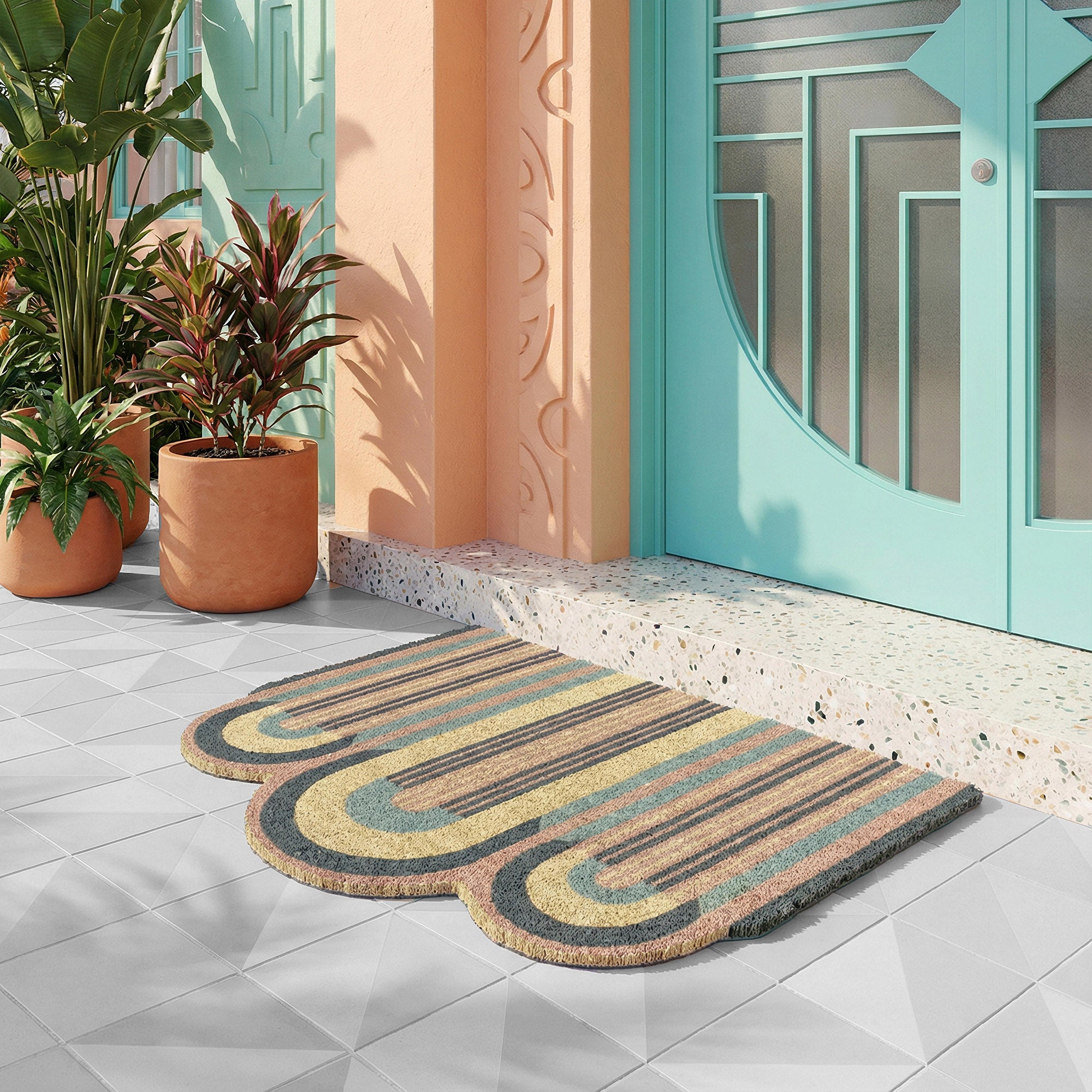As if a medley of colors were oozing out from beneath the doorway, 'Deco Waves' makes a fabulous first impression to the home. The curved silhouette adds a fun touch, welcoming guests with an impression of art-deco style.